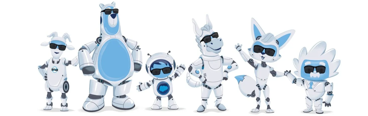 Each character has a big job to do. They represent personas, products, and technologies found within the Salesforce Ecosystem, offering a peek into life inside and outside the company. Together, they tell the story of Salesforce.